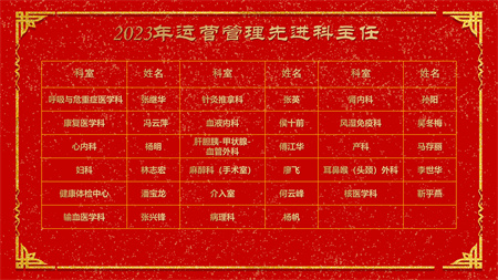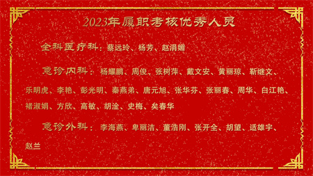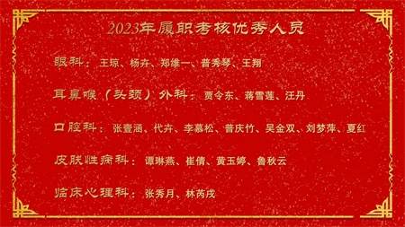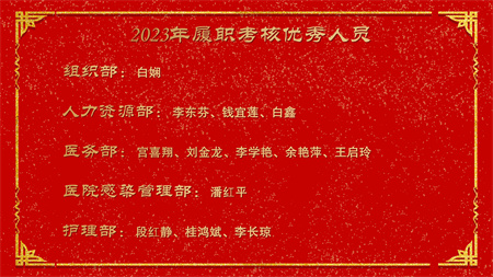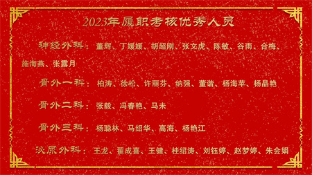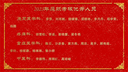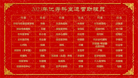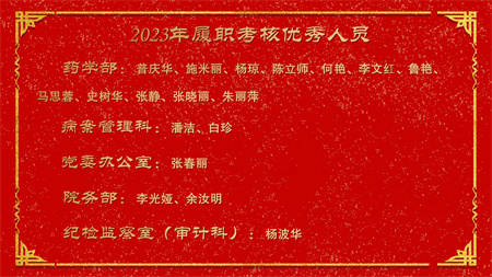 各副院级领导、保留原职级待遇领导分别安排2024年重点工作,副院长赵云焰安排部署春节前及春节期间安全生产工作,党委副书记杨玲、副院长吕天虎、副院长周云波、副院长张靖、保留原职级待遇领导朱红媛分别对2023年度履职考核优秀人员、2023年度杰出医护技人员、从事医疗事业三十年职工、2023年护理竞赛获奖人员、昆医和大理大学教学竞赛获奖、评优评先、院内教学竞赛获奖人员及2023年优秀科室运营助理员及运营管理先进科主任进行了通报表扬。